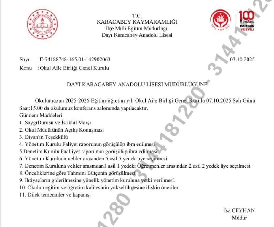 Okulumuzun 2025-2026 Eğitim-öğretim yılı Okul Aile Birliği Genel Kurulu 07.10.2024 Salı Günü Saat:15.00 da okulumuz konferans salonunda yapılacaktır.